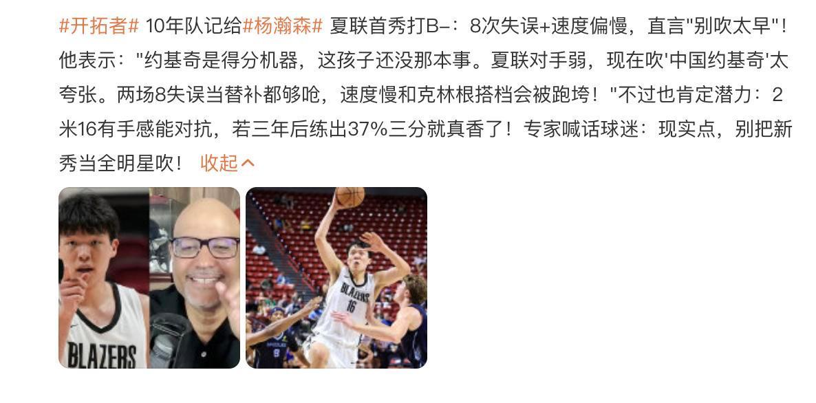 然而,在参加完两场夏季联赛后,杨翰森的媒体评分却出现了明显下滑,从最初的A级下降至B-级。更令人意外的是,开拓者队随队记者也对他进行了较为严厉的点评,这究竟是怎么回事呢?